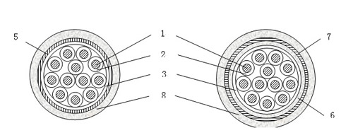 5--- 銅帶屏蔽; 6--- 內護層; 7--- 鋼帶鎧裝; 8--- 聚烯烴護套。